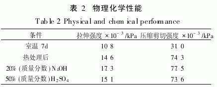 采用上述的聚合途經(jīng)和施工操作步驟,制備了呋喃樹(shù)脂膠黏劑,并對(duì)膠的抗拉、抗壓及腐蝕后的性能進(jìn)行了測(cè)試,其結(jié)果表明:該膠各種性能都不同程度的有所改善。