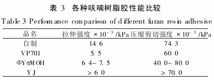 為自制膠與西德VP701和蘇聯(lián)ΦYαMOH及國(guó)產(chǎn)YJ呋喃樹(shù)脂膠性能比較。