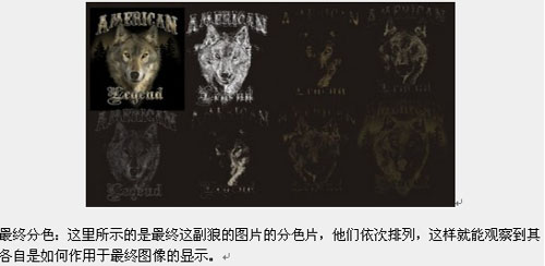 此過程中各個步驟的前后順序極為重要,因為在最終所示圖片處理的過程中誰都不希望看到出現(xiàn)擁有太多顏色數(shù)的圖片。將圖像導(dǎo)入到圖片文件或作排版合并之前就對圖像進行編輯,這樣要容易實現(xiàn)得多。最后還有一些步驟用于確定圖片中狼的位置,鏡像復(fù)制下方細線條的部位,創(chuàng)建副本的臨時蒙版,供背景內(nèi)容的提取之用,接著再復(fù)制圖層,用圖層命令填充實地的K色和W色,復(fù)制到一個通道中,創(chuàng)建一個用作剔除部分的選區(qū)。