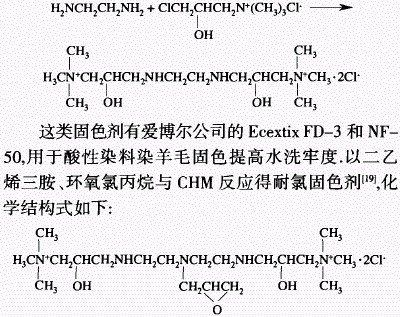【集萃網(wǎng)觀察】環(huán)保型無(wú)甲醛固色劑:用于活性染料、酸性染料的染色以提高染色牢度.主要有陽(yáng)離子樹(shù)脂型固色劑,由多乙烯多胺和雙氰胺縮聚而成,如Sandoz公司的Indosol CR、E一50,日華公司的Neofix RP一70、SS,三洋化成的Sunfix 555一FTr、PRO一100等,用于活性染料提高濕牢度;季銨鹽類固色劑如乙二胺與3一氯一2一羥丙基氯化銨(CHM)反應(yīng)而得,反應(yīng)式如下: