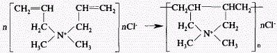 目前使用最廣的品種是二烯丙基二甲基氯化銨(DMDAAC)聚合而成的聚季銨類固色劑.特點(diǎn)是季銨鹽的陽(yáng)電荷氮原子位于聚合物的主鏈上,對(duì)纖維有很大的親和力,用于活性染料染纖維素纖維.反應(yīng)如下: