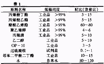 ① 將計量的水、聚乙烯醇分別加入反應(yīng)釜中,升溫至80~100℃ 攪拌,待聚乙烯醇完全溶解后,加入計量的乳化劑OP—i0攪拌30~50 m]n。