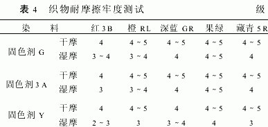 從表4可知,固色劑G和3A干、濕摩擦牢度相仿,與固色劑Y的干摩擦牢度相差不大,有些顏色提高0 5級(jí),而濕摩擦牢度一般均能提高0 5級(jí)甚至1級(jí)。