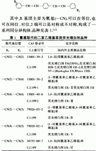 用氰基取代的二苯乙烯基苯具有相當(dāng)高的熒光量子產(chǎn)率,增白效果很好,特別是2端都是鄰位的氰基,商品名稱是熒光增白劑ER(330%),主要用于聚酯纖維,它可溶于大多數(shù)有機(jī)溶劑,對陽離子柔軟劑穩(wěn)定,可與次氯酸鈉、雙氧水或還原性漂白劑同浴使用,其色光純正,增自強(qiáng)度高,增白效率是傳統(tǒng)的滌綸用熒光增白劑DT(屬雙苯并嚼唑類型)的10倍左右,適用于多種增白工藝,特別適用于低溫吸附固著法增白,還適用于醋酸纖維及錦綸等纖維的增白.其商品劑型有粉狀物和穩(wěn)定的分散液等.另外對塑料等聚合物的增白效果也很好,至今仍是其他一些熒光增白劑還不能替代的品種.