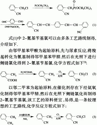 2一氰基芐基氯與亞磷酸三乙酯發(fā)生維蒂希一霍爾納反應(yīng),生成相應(yīng)的維蒂希試劑(鄰氰基芐基磷酸二乙酯),再與對苯二甲醛在DMF中,甲醇鈉存在下進(jìn)行縮合反應(yīng),再經(jīng)精制得到.化學(xué)反應(yīng)方程式如下: