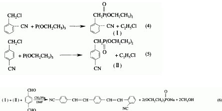 另一個(gè)代表品種是熒光增白劑ER—II,由2一氰基芐基氯和4一氰基芐基氯分別與亞磷酸三乙酯發(fā)生維蒂希一霍爾納反應(yīng),得到2種產(chǎn)物(鄰氰基芐基磷酸二乙酯和對氰基芐基磷酸二乙酯),在DMF中甲醇鈉存在下,先將鄰位酯化物和對苯二甲醛發(fā)生縮合反應(yīng),第一次縮合產(chǎn)物在基本相同條件下再將對位酯化物加入繼續(xù)進(jìn)行縮合反應(yīng).最后經(jīng)精制而制得,化學(xué)反應(yīng)方程式如式(4)~式(6):