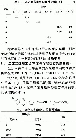 二苯乙烯基苯類熒光增白劑同分異構(gòu)體之間或與其他一些化學(xué)結(jié)構(gòu)類型的熒光增白劑按一定比例混合成復(fù)配型熒光增白劑可提高增白效果,在保持原有增白白度的前提下使用復(fù)配型熒光增白劑可減少使用量.另外應(yīng)用性能(如耐日曬牢度,耐氣候牢度、耐熱牢度等)均比單一組分有所提高,還能調(diào)整色光,使被增白的物品外觀更加悅目.這種增效效應(yīng)有明顯的經(jīng)濟(jì)和社會效益,受到使用者的歡迎.