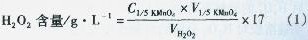 用移液管吸取10 mL H:0:漂液于預(yù)先加入20 mL蒸餾水構(gòu)100 mL錐形瓶中,加入濃度C1/2H2S04為6 mol/L的硫酸溶液20 mL,用濃度C1/5KMnO4為0.100 mol/L的高錳酸鉀標準溶液滴定,當溶液從無色至恰顯微紅色時(30 s紅色不消失)即為終點。記下消耗的KMnO4標準溶液的體積,重復(fù)3次,取平均值。H202含量及分解率按下列公式計算: