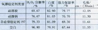 硅溶膠對雙氧水分解的延緩作用顯著。本試驗研究硅溶膠的氧漂穩(wěn)定性能,并將其應(yīng)用于不同氧漂工藝中,與其它氧漂穩(wěn)定劑作對比。