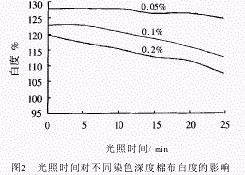從圖2可見,染色深度越低、光照時間越長,白度降低越多;染色深度(0.2%)越高,受光照的影響越小,光照15min以后白度才有所降低.這說明光對熒光增白劑的水溶液、織物的白度均有影響,并且染色深度越低,影響越大.試驗還發(fā)現(xiàn),將以上增白的棉布在同樣的光源下光照0、10、40min,然后再測其白度,它們的白度幾乎沒有變化.