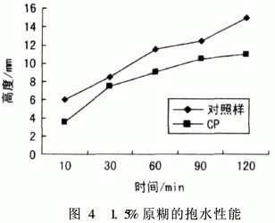 將合成增稠劑配制成1. 5%原糊,將帶有刻度的層析濾紙(寬約2 cm)垂直插入原糊中,測(cè)定一定時(shí)間后濾紙上的滲水高度,結(jié)果見圖4。 抱水性能指原糊對(duì)水分子的抱合能力。糊料抱水性越好,其中可自由運(yùn)動(dòng)構(gòu)成滲化的游離水就越少,越利于印制精細(xì)圖案和清晰花紋。由圖4可知,增稠劑 CP表現(xiàn)出更好的抱水性能。