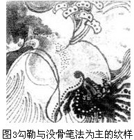 用大潑筆法,簡(jiǎn)單明快地勾畫出地紋,用工筆重彩在畫面上勾畫出裝飾性強(qiáng)烈的主紋,穿插其問或羅列重疊。主紋濃艷。副紋清晰,地紋則以潑墨潤(rùn)濕,如水氣氤氳。總體效果渾厚豐富,層次多變,有暗中透亮的效果(圖2)。這類圖案可用直印工藝加雕印線條的方法體現(xiàn)。