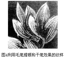 主要用于大花頭、葉片等的層次顯示,為呈現(xiàn)干筆效果用撇絲處理(圖4)。 2.1.6 獨(dú)枝花卉適用于單件料