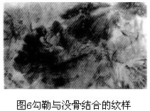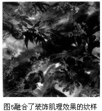 水墨圖案就要有水墨畫的特殊風(fēng)格。所謂風(fēng)格是內(nèi)容與形式的有機(jī)統(tǒng)一,或者是性格氣質(zhì)與藝術(shù)技巧的創(chuàng)作個(gè)性。水墨畫的個(gè)性也正是要突出毛筆的造型藝術(shù),體現(xiàn)水墨畫的筆風(fēng)和造型的別致、蒼勁的韻味。如潑墨,一筆下注,畫面淋漓而凝重,表現(xiàn)出景物雄勁蒼倔,蒼潤(rùn)渾厚。簡(jiǎn)勁粗獷。為此作為圖案的主紋。則顯明而突出,層次豐富而多變,是剛?cè)嵯喑实淖钸m宜手法。又如工筆技巧,則工致細(xì)密,嚴(yán)謹(jǐn)不苛,清麗自然,寧?kù)o疏淡,使造型清新準(zhǔn)確。如果兩者結(jié)合運(yùn)用,則行筆落墨奔放灑脫,顯示出精奇?zhèn)ミ_(dá),可書急風(fēng)驟雨的場(chǎng)面,也可表現(xiàn)險(xiǎn)峻奇拔的景致,千姿百態(tài),有強(qiáng)烈的藝術(shù)魅力。 另外在水墨圖案中也常用干筆筆法,該法能豐富造型,給人以蒼勁老辣的感覺。反之,筆墨豐潤(rùn),水分飽滿,則畫卷給人以滋潤(rùn)渾厚的感覺。故有干烈秋風(fēng),潤(rùn)含春雨的形態(tài)。這正是利用了水墨畫中以墨行神、意在其中的風(fēng)格派路。而且用筆的徐緩與飛揚(yáng),又可給人以持重含蓄,或者灑脫歡暢的寓意。為此掌握了水墨畫的繪寫技巧,再融合圖案裝飾機(jī)理效果的方法(圖5)如松枝,玻璃板粘貼、海綿團(tuán)戳印等等的特殊手法,則圖案可呈現(xiàn)出錯(cuò)落有致,千變?nèi)f化的裝飾圖樣。然而,筆法技巧只是形成圖案的基本功力,還必須融合圖案畫的表現(xiàn)需要,采用重疊法、剪裁法、錯(cuò)位法、正中置異、亂中求正、化整為零、繁簡(jiǎn)對(duì)比的形式,創(chuàng)造符合流行花色需要的多種多樣的裝飾圖案。 3 水墨圖案的設(shè)色與傳統(tǒng)風(fēng)格