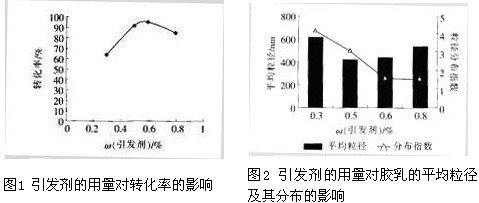 (3)隨著引發(fā)劑的用量的增大,單體的轉(zhuǎn)化率先增大后減小,引發(fā)劑的用量為0.6%時,單體的轉(zhuǎn)化率達到最高,為94.6%;乳膠粒子的平均粒徑逐漸減小,然后又略有增大;粒徑分布則一直變窄。