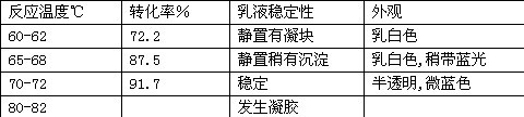 (4)反應(yīng)溫度控制在70~72℃時,轉(zhuǎn)化率較高,可達91.7%,乳液的穩(wěn)定性較好。
