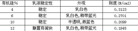 八甲基環(huán)四硅氧烷的開環(huán)聚合和丙烯酸酯類單體的自由基聚合,是按照不同機理進行的,自由基鏈的增長反應(yīng)和八甲基環(huán)四硅氧烷的開環(huán)聚合鏈增長反應(yīng)都是在短時間內(nèi)完成,按照各自的聚合機理形成同步互穿聚合物網(wǎng)絡(luò)結(jié)構(gòu)(IPN)。因此八甲基環(huán)四硅氧烷的用量對體系穩(wěn)定性的影響較大,本文考察了有機硅功能性單體的用量對乳液的影響,實驗結(jié)果如表4所示。