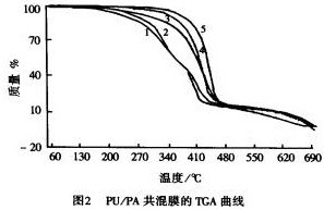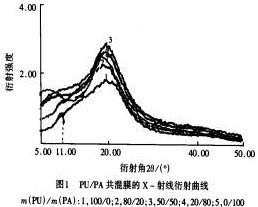 1 實驗部分 1.1 主要原料 2,4-甲苯二異氰酸酯(TDI)、丁酮均為分析純,聚醚多元醇(相對分子質量2000)、二甘醇、三羥甲基丙烷(TMP)、二羥甲基丙酸(DMPA)、三乙胺(TEA)、丙烯酸乳液(浙江三木化工有限公司)均為工業(yè)品。 1.2 水性聚氨酯乳液的合成 將脫水后的聚醚多元醇和TDI按一定比例分別加入裝有溫度計、攪拌器及回流冷凝管的三口燒瓶中,在75℃左右保溫2h,再加入DMPA及適量的丁酮,反應1h后再加入二甘醇及TMP的丁酮溶液,繼續(xù)反應1h后冷卻至40℃左右,用TEA中和至pH值7~8,在高速攪拌條件下,加入去離子水,繼續(xù)攪拌15min左右,即得含固量約為25%的水性聚氨酯乳液。 1.3膠膜的制備 將水性聚氨酯乳液和丙烯酸酯乳液以不同的配比放入燒杯中攪拌15min左右,然后將乳液在聚四氟乙烯板上流涎成膜,常溫下靜置72h,然后放入烘箱中,在130℃下焙烘90min即得所需的膜。 1.4膜的結構及性能測試 1.4.1 X射線衍射 采用D/MAX-3CX射線衍射儀測定不同配比的共混膜的衍射強度曲線. 1.4.2熱失重分析(TGA) 采用PERKIN-ELMER DSC7型熱分析儀測試其熱失重(TGA)曲線。 1.4.3 斷裂強度及斷裂伸長率 用刀片將共混膜樣品制成10mm×60mm的細長條,然后用螺旋測微器在每條樣品上取3個點測定厚度,取平均值.樣品在恒溫、恒濕條件下(T=13.5℃,RH=70.5%)下平衡24h后,在Instron l211型強伸儀上測定共混膜的絕對斷裂強度(N)和絕對斷裂伸長(mm),樣品夾持長度為50mm.最后以下面公式計算 相對強度(N/mm2)和伸長率(%). 2 結果與討論 2.1 膜的結構 2.1.1 X射線衍射 PU/PA共混膜的X-射線衍射曲線如圖1所示 從圖1可以看出,曲線1(PU)在20.00°有一較強的峰,在11.00°左右還有一微弱的峰,隨著PA含量的增加,PU的這兩個峰均增強,其中20.00°的衍射峰增強得更加明顯.此現(xiàn)象表明,兩者之間存在某種相互作用,即丙烯酸的加入促進了PU結晶的形成.PU的結晶主要是由硬段中的氨酯基-NHCOOR與PA中的-COOH等極性基團間形成了氫鍵,提高了PU硬段的結晶度。 2.1.2 熱分析 PU/PA共混膜的TGA曲線見圖2. 從圖2可以看出,聚氨酯在270-480℃分兩個階段失重,低溫為軟段的分解溫度,高溫為硬段的分解溫度.這就證實了聚氨酯中存在微相分離的說法.而聚丙烯酸酯的失重只有一個階段,最大失重率出現(xiàn)在420℃,說明PA為均相體系.共混膜中,隨著PA含量的增加,臺階越來越不明顯,PA含量達到80%時,體系已呈均相(曲線4).而且隨著PA含量的增加,分解溫度也逐漸向高溫移動.PU/PA共混膜的TGA曲線表明,PU和PA并不完全相容,還有一定的相分離,PA的加入提高了PU膜的熱穩(wěn)定性。 2.2膜的力學性能 PU/PA共混膜的斷裂強度及斷裂伸長率見表1. 由表1可看出,PA的加入有利于提高PU的強度和伸長率,當PU/PA共混膜中PA的含量為20%時,共混膜的強度和伸長率均達到最大值,因此,要獲得較好力學性能的共混膜,PA的含量≤20%。 3 結論 通過丙烯酸酯共混改性水性聚氨酯膜的結構和性能研究,表明PU和PA存在某種相互作用,使兩者能有較好的相容性,但PU和PA并不完全相容,還有一定的相分離,PA的加入提高PU膜的熱穩(wěn)定性.當PA的含量≤20%時,共混膜具有較好的力學性能。 表1 共混膜(PU/PA)的斷裂強度及斷裂伸長率 參考文獻: [1I 曹坤,吳鍵芬,孫建中等.水性聚氨酯研究進展[J]高分子通報,1994,(3):156-159 [2] Matsuda K,Ohmura H.Emulsion of Polyurethane Having Setting Properties[J]Joumal of Applied Polymer Science,1979,(23):141-153 [3] Tamakj T.Recent Developmemt in Waterbome Polyurethane Dispersions [J]DIC Tech Rev,1997,(3):1-5 [4]Satguru R,McMabon J,Padget JC et al. Aqueous Polyurethane for Surface Coatings[J]Surface Coatings International,1994,77(10):424-426 [5] 李芝華 鄭子樵,丙烯酸樹脂改性的水性聚氨酯性能與結構[J]化學與粘合,2000,(4):155-157 [6] Bakker F. Developmemt and App1ication Properties of Acrylic and Urethane Dispersion[J] Paint Polymers and colour Journal,1992,182 (4310):376-377 [7] 李延科 凌愛蓮,丙烯酸酯改性水性聚氨酯乳液性能的研究[J]化工新材料,2000,(5):31-32 [8] 陳義芳,聚氨酯-丙烯酸互穿網(wǎng)絡聚合物乳液制備[J]聚氨酯工業(yè),1999,14(3):10-13 [9] Jansse PL.Development in waterborne Urethane and Urethane-Acry1ate Binders [J]Paint Polymers and Colour Journal,1991,181(4287):398-404 [10] 李芝華 李菊仁,丙烯酸樹脂改性的水性聚氨酯紅外光譜分析[J]湖南師范大學自然科學學報,1999,22(3):45-48 [11] 尹朝輝 張洪濤 林柳蘭,聚氨酯-丙烯酸酯復合乳液的新進展[J]涂料工業(yè),1998,(12):31-34 來源: 印染在線 作者:邵菊美,陳國強,史麗穎,周紹強,顧紅桃(蘇州大學材料工程學院, 江蘇蘇州215021) 作者簡介:邵菊美(1978-),女,浙江金華,碩士,主要從事紡織助劑的研究開發(fā)工作