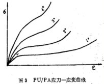 二.合成 (一)操作簡述 在裝置中加40克聚醚(2000分子量),在100℃下減壓蒸餾(真空度67mmHg)l小時,除去微量的水。 然后在另一裝置中加18克苯(約18毫升),6.96克甲苯二異氰酸酯 (約5.8毫升),用氮氣保護,在78-80℃反應(yīng)3.5小時,得棕黃色透明預(yù)聚體。 取20克預(yù)聚體于反應(yīng)后一裝置中,加0.2克乙二醇,在35℃反應(yīng)30分鐘。在氮氣下,在溫度低于5℃時滴加40毫升丁酮與O.7毫升二乙烯三胺的混合液,25分鐘滴加完畢;再滴加8毫升丁酮與0.6毫升環(huán)氧氯丙烷的混合液,10分鐘加畢,滴加15毫升丁酮與0.66克順丁烯二酸酐的混合液,10分鐘加畢;在50℃反應(yīng)60分鐘;再在室溫下加0.2克氫氧化鈉和40毫升蒸餾水,得乳白色液體。在溫度5O℃減壓蒸餾(真空度9mmHg)除溶劑,得與水無限稀釋的PU乳液。 (二)PU乳液的幾種物理性質(zhì) 表l PU乳液的幾種物理性質(zhì) 三.性能測試、結(jié)果討論 (一)聚氨酯乳液(PU)與丙烯酸酯涂層粘合劑乳液(PA)共混性和混液穩(wěn)定性。 1.DSC分析(示差掃描量熱計) PU/PA共混物的DSC實驗曲線得到玻璃化溫度,如表2。 表2 PU/PA共混合物的玻璃化溫廢 從試驗結(jié)果看,PU和PA乳液的共混是相容性好的共混[2]。因為它們不同比例的共混液都只有一個玻璃化溫度;煲涸跍囟8-43℃放置長達半年之久仍未見任何異常現(xiàn)象. 2.動態(tài)粘彈分析 PU/PA共混物的動態(tài)粘彈實驗與DSC結(jié)果一致,見圖1。 條件;頻率;110赫茲 升溫速度;3度/分 結(jié)果;PU︰PA=6︰1 T;-7.3℃ (二)PU/PA共混液膜的拉伸性能 1. 高分子聚合物拉伸時其應(yīng)力-應(yīng)變曲線(δ-ε)可以概括為以下五種;見圖2。 不難推論,作為防水涂層粘合劑,若要得到高耐水壓涂層織物,從涂層劑本身考慮,膜應(yīng)具有一定的強度。但作為紡織品,兼顧服用的舒適性等問題,膜要有一定的彈性,反應(yīng)在δ-ε曲線上應(yīng)是硬而韌的膜。 2.PU/PA共混液膜的應(yīng)力-應(yīng)變曲線如圖3。其測試的數(shù)據(jù)見表3。 儀器:日本島津DSS一500萬能材料試驗機 實驗條件:夾間距 lOmm 有效面積 5×lOmm2 溫度 2O℃ 濕度 65% 下降速度 30mm/min 表3 PU/PA共混液膜的拉伸性能 不難看出,PU含量越大(共混液中),材料越接近硬而韌的膜。按推論耐水壓應(yīng)趨于增大,實際測試結(jié)果正是如此。 (三)防水涂層試驗、結(jié)果討論 1.試驗用設(shè)備 瑞士進口涂層機;浸軋液設(shè)備;沾水性測試裝置;耐水壓測試裝置等。 2.涂層工藝 基布;市售尼龍塔夫綢 工藝;預(yù)軋防水劑(三浸三軋)→烘干(100℃×l.5分) →涂層→預(yù)烘(110℃×l分) →焙烘(150℃×3分) 軋防水劑條件;壓力5kg/cm2,軋液率80%。 刮刀式干法涂層; 涂層劑配方;涂層劑50克;增稠劑0.4%,消泡劑0.2%;前處理防水劑Livozol N-750,濃度25克/升。 注;在調(diào)漿時先將增稠劑用水調(diào)勻,再加粘合劑攪勻。 涂層織物性能測試結(jié)果見表4,從測試結(jié)果看,也證明了越接近硬而韌的膜,其涂層后織物的耐水壓越高,同時說明了PU對PA耐水壓有明顯改善。 一般涂層織物的涂布量在15~25g/m2,甚至有時達40 g/m2,而我們利用PU改性PA后進行一次性涂布涂布量在7 g/m2左右,共混液中PU︰PA=1︰6,就可比純PA涂層織物的耐水壓提高近一倍。 表4 防水涂層試驗結(jié)果 四、結(jié)論 1.本文合成了自交聯(lián)、自乳化的水性聚氨酯乳液PU。制備的乳液顆粒均勻且小,穩(wěn)定性優(yōu)良,可用于紡織品的防水涂層領(lǐng)城,其應(yīng)用有待于開發(fā)。 2.本文制備的PU和丙烯酸酯防水涂層粘合劑乳液PA的共混是相容性好的共混,其共混亦有優(yōu)良的性穩(wěn)定性。 3.本文制備的PU可以較明顯改善PA的耐水壓性、耐洗性、手感、涂層織物無發(fā)自現(xiàn)象。 參考文獻 [l]Johnt.Lermani;J.of Coating Fabric. 14(4)1985 [2]《高分子物理》第1版,復(fù)且大學(xué)出版社,1983年 [3]Jpn.Kokai 7873293 [4]J.p.7917358