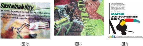 因此,在很大程度上新型水性漿料可以與傳統(tǒng)的熱固油墨一樣印制出絕大多數(shù)的各種印花效果來。如圖七/圖八/圖九所展示的印花,就是新型水性漿料制作出的部分效果,在手感和遮蓋力方面可以進(jìn)行充分的調(diào)整和互補(bǔ)。所有的顏色包括白色在內(nèi),都是使用Matsui松井301系列水性油墨,以355線的網(wǎng)版作出的效果,正是因?yàn)樽鳛榇虻椎冒咨彩褂昧烁呔W(wǎng)目網(wǎng)版進(jìn)行印制,因此烘干時(shí)間得以大幅縮短,并與標(biāo)準(zhǔn)的熱固油墨達(dá)到相同的水平。 通過精確調(diào)整色漿的黏度,我們就可以在深色面料上得到顏色精確、色光鮮艷和遮蓋力高的環(huán)保印花來,這類水性漿料也是到目前為止在市場上最為綠色的環(huán)保漿料。也是眾多印花廠作為可再生性原料和工藝的最佳選擇。