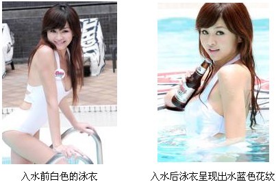 水變漿:出水芙蓉變色龍更受歡迎看,模特身上貼身的白色性感泳衣瞬間變成水藍色——這可不是燈光特技效果,而是因為模特身上穿的是采用水變漿印制的泳衣。水變漿,一種可以遇到水就變色的膠漿,它在無水狀態(tài)下是無色的,當遇到水時就會變色,從無色變有色,常用于泳衣印制,能讓您像出水芙蓉一樣美麗。