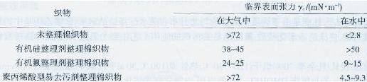 經(jīng)整理紡織品的臨界表面張力低于水性污和油性污,這是整理紡織品能在大氣中拒水拒污的原因.可是在洗滌時(shí)與未經(jīng)整理的紡織品相比,整理過的紡織品反而有吸附洗液中污垢的傾向,產(chǎn)生上述現(xiàn)象的原因?捎貌煌悇e的整理劑整理的棉織物在水中和大氣中臨界表面張力的變化來說明,如表1所示.