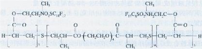 應(yīng)用含有低表面能的含氟鏈段與親水性的聚氧乙烯鏈段的混合型嵌段共聚物,可同時(shí)達(dá)到相對立的兩種效應(yīng),這種親水性含氟防污易去污整理劑的結(jié)構(gòu)如下所示.應(yīng)用含有低表面能的含氟鏈段與親水性的聚氧乙烯鏈段的混合型嵌段共聚物,可同時(shí)達(dá)到相對立的兩種效應(yīng),這種親水性含氟防污易去污整理劑的結(jié)構(gòu)如下所示. 混合型含氟嵌段共聚物在空氣中是疏油的,而在水中是親水的.這種雙重功能效應(yīng)是由于它在空氣中和在水中疏油性鏈段和親水性鏈段排列的方向不同引起的.在空氣中,聚氧乙烯鏈段呈卷曲狀態(tài),拒油性含氟鏈段在紡織品表面定向密集排列,形成具有低表面能的表面而具有拒油性能.在水中,聚氧乙烯產(chǎn)生水合作用而伸展,在織物表面定向排列,通過界面張力變化賦予纖維表面親水性,使纖維具有易去污和防止?jié)裨僬次坌阅?在烘干過程中,親水性鏈段脫水,含氟鏈段重新占有其主要界面.用親水性含氟嵌段共聚物易去污整理劑與適當(dāng)?shù)慕宦?lián)劑(如DMDHEU)共同使用,可提高干態(tài)防污性,并賦予織物較好的易去污性能.