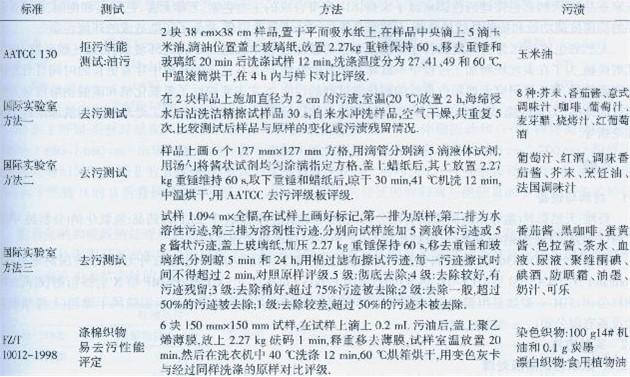 目前,我國對易去污類整理紡織產(chǎn)品的性能測試主要采用四類標(biāo)準(zhǔn)方法,即美國標(biāo)準(zhǔn)(AATCC和ASTM)、歐洲標(biāo)準(zhǔn)Iso)、中國標(biāo)準(zhǔn)(GB/T和FT/z)和實(shí)驗(yàn)室標(biāo)準(zhǔn)(BV、3M、DuPont和ITS等).出口產(chǎn)品則根據(jù)不同客戶的習(xí)慣和要求,基本采用美標(biāo)、歐標(biāo)和實(shí)驗(yàn)室標(biāo)準(zhǔn).具體測試指標(biāo)根據(jù)產(chǎn)品要求確定,其中,易去污測試則是將油滴或不同污物施加到織物上,再進(jìn)行一定條件的水洗,判斷污跡殘留狀況.