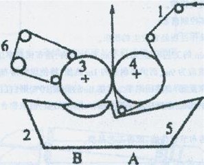 常采用浸軋法與面軋法。圖3是臥式低給液軋車,A槽為還原染料浸軋工藝液,B槽用于活性染料面軋工藝液,軋輥3帶液轉(zhuǎn)移到織物上。由于織物未進軋槽,單面給液,所以帶液量明顯比浸軋法低。