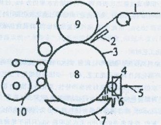 1織物;2吸液;3液膜;4磁棒;5變量;6計量刮刀;7液槽;8橡膠輥;9壓力輥;10清潔輥