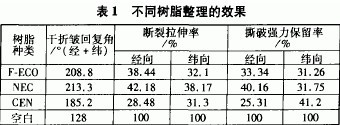 2 結(jié)果與討論 2.1 單因素分析 2.1.1 不同樹脂整理的影響 不同樹脂對整理效果的影響結(jié)果見表1。