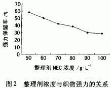 由表1知,NEC樹脂整理織物的干折皺回復角(經(jīng)+緯)最大,強力保留率也較好,因此選用低甲醛樹脂整理劑NEC做進一步試驗。