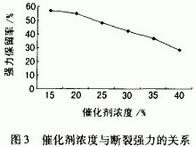 由圖3、4知,隨著催化劑濃度提高,整理后織物的折皺回復角有所提高,但斷裂強力明顯下降。由于催化劑濃度的提高促進織物上樹脂的交聯(lián)作用,從而使織物的抗皺性能提高;但由于增加了織物的交聯(lián)程度,限制了纖維素大分子鏈段的相對位移。因此,降低了纖維和織物的延伸性,使織物拉伸時內(nèi)應力集中,最終使強力下降。