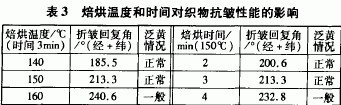 織物整理時的焙烘溫度和時間,是影響整理效果的重要因素。我們分別采用不同的焙烘溫度和時間,對織物進行整理試驗,測定織物的折皺回復角,觀察織物表面的泛黃程度(表3)。
