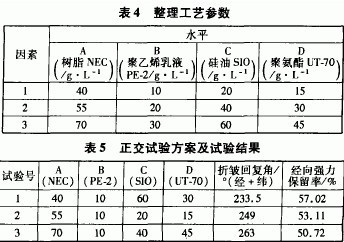 為了優(yōu)化工藝配方,我們對影響整理效果的主要因素采用L9(3 )正交試驗,以獲得最佳工藝配方。四個因子為整理劑濃度、聚乙烯乳液PE-2濃度、硅油SIO濃度和聚氨酯UT-70濃度;每個因子分三個水平進行研究,焙烘條件為150 oC X 3 min,整理效果用折皺回復角和經(jīng)向強力保留率來評價(表4—6)。