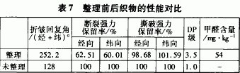 由表7知,整理的織物抗皺回復角明顯優(yōu)于未整理織物,但斷裂強力下降較多,撕破強力變化不大。