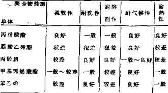 自交鏈型粘合劑一般為多元共聚物乳液,其性能與所用單體的類型和用量關(guān)系極大,常采用兩種或兩種以上不同特性的(軟、硬單體)單體進(jìn)行共聚來獲得綜合性能優(yōu)良的產(chǎn)品,常用單體聚合后的主要性能和幾種共聚物乳液的性能比較分別見表1和表2。