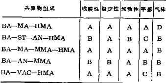 表1 常用單體聚合后的主要性能 表2 幾種共聚物乳液的性能比較 注:性能好壞按A>B>C>D的順序變化,BA為丙烯酸丁酯,MA為丙烯酸甲酯;HMA為羥甲基丙烯酰胺,ST為苯乙烯,AN為丙烯腈;VAC為醋酸乙烯,MMA為甲基丙烯酸甲酯。