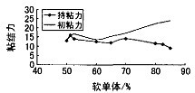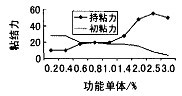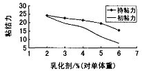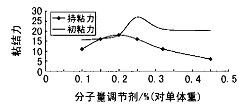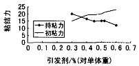 1 試驗部分 1.1 原料 丙烯酸丁酯、丙烯酸乙酯、醋酸乙烯酯、丙烯酸、丙烯酸-2-乙基己酯、十二烷基硫醇(以上均為工業(yè)純);N-羥甲基丙烯酰胺、過硫酸胺(以上為分析純);復合乳化劑(工業(yè)純)。上述產品均為市售。 1.2 聚合工藝 采用預乳化全滴加聚合工藝。 (1)先將部分水、復合乳化劑加人到四口反應瓶中,開啟攪拌,將混合單體慢慢加入反應瓶中,預乳化1h,放出預乳液,待用。 (2)將剩余的水、乳化劑加人反應瓶中,開啟攪拌,升溫至8O℃,開始滴加預乳液,并一次投人引發(fā)劑,加料和保溫時間都為2 h。 1.3 性能測試 表征臺板膠粘結性能即粘結力的指標有四種:初粘力71(tack)、粘結力A(adhesion)、內聚力C(eohesion)和粘基力 (keying)。性能良好的臺板膠必須滿足如下的平衡關系:T<A<C<K。 T—— 又稱快粘力,當粘制品和被粘制品以很輕的壓力接觸后,立即快速分離時所表現(xiàn)出的抗分離能力,參照GB/T 4852-1984測定。 A——一般用膠粘制品的18O°剝離強度來表征,參照GB/T 2792-l981測定。 K——l8O°剝離測試中膠層和基材脫開時所測得的剝離強度。正常情況下粘基力大于粘結力,故無法測得此值。 C——指臺板膠本身的強度,一般用膠粘制品粘貼后抵抗剪切蠕變的能力,即持粘力來表示,參照GB/T 485l-l998測定。 如滿足T<A<C<K的關系,膠粘劑制品不但具備對壓力敏感的粘結特性,而且還能滿足應用的基本要求,否則,就會產生種種質量問題。例如,T≥A,則對壓力不敏感;若A≥C,則揭除膠粘制品時會出現(xiàn)膠層破壞,導致膠粘劑沾污被粘表面,拉絲或粘背等弊。蝗鬋≥K,就會產生脫膠(膠層脫離基材)的現(xiàn)象。 可見,臺板膠粘劑的上述四大粘結性能及其相互之間的關系,就是它們的基本性能。在研究和制備臺板膠粘劑時,必須首先滿足這些性能要求。 2 結果與討論 2.1 單體 在臺板膠中,軟單體的主要作用是保持膠粘劑的初粘力和剝離強度,而硬單體的主要作用是提高乳液膠粘劑持粘性。因此,單體的選擇對臺板膠的性能影響很大。如選用硬單體作原料,則膠的硬度高、脆性大,這類單體含量不能多,否則膠粘劑將失去粘性。而選用軟單體作原料,則膠的粘性、柔韌性好,且隨著酯基中碳原子數(shù)的增加,膠的柔韌性也相應增加。在實際工藝配方中,常選用多種單體配合協(xié)調,優(yōu)勢互補,制備出符合應用要求的產品。 為了使乳液膠粘劑剝離強度、初粘力和持粘力相匹配,必須將玻璃化溫度很低的軟單體與玻璃化溫度很高的硬單體按一定比例配合,這樣可使膠粘劑在保持一定內聚力的前提下,具備很好的初粘性和持粘力。 圖1 軟單體用量對粘結性能的影響 從圖1可知,隨著軟單體的增加,初粘力T逐漸增大,持粘力C則變化不大,且在軟單體用量較少的情況下相對較大。 帶有羧基、羥基、氨基等官能團的功能單體,與其它單體共聚后,可在大分子鏈上引入極性基團,使聚合物分子鏈間以及聚合物與被粘物表面間進行一定程度的氫鍵交聯(lián),從而使聚合物的內聚強度和粘合性能都有較大的提高。作為臺板膠的應用性能指標,粘結力A和持粘力C必須達到一定數(shù)值,因此在配方設計中減小了硬單體用量,以期利用功能單體和官能團之間的交聯(lián)作用,及其鏈端的遷移作用,使聚合物內聚力和粘合力之間達到較好的平衡(圖2)。 圖2 功能單體用量對粘結性能的影響 2.2 乳化劑 丙烯酸酯乳液聚合常用陰離子型和非離子型乳化劑。陰離子型乳化劑的特點是乳化效率高,能有效降低表面張力和界面張力,因而用量較少,它生成的膠束小,可制成細粒乳液,易起泡沫;而非離子型乳化劑的特點正好相反。因而兩種乳化劑混用可達到取長補短的效果,乳化劑的用量一般為單體用量的2.5%左右。 圖3 乳化劑用量對粘結性能的影響 從圖3可知,隨著乳化劑用量增大,初粘力T、持粘力C逐漸減小,乳液凝聚率減小。這是因為乳化劑向膠層表面遷移,會形成一個小分子界面層,從而使聚合物的各項性能均有一定程度下降。 2.3 引發(fā)劑 在引發(fā)劑用量為單體總量的0.2%~0.8%時,丙烯酸酯乳液膠粘劑的粘結性能與引發(fā)劑用量的關系如圖4所示。 圖4 引發(fā)劑用量對粘合性能的影響 由圖4可見,引發(fā)劑用量太少或太多均會降低膠粘劑的粘結性能。引發(fā)劑用量太大時,聚合物分子量小,抗外力作用差,初粘力較低,使得膠結后剝離強度;而當引發(fā)劑用量太少時,聚合物分子量太大,共聚物與被粘物表面作用力小,影響膠結時的持粘力,亦會降低剝離強度。同樣,隨著引發(fā)劑用量的增加,聚合物分子量降低,導致其內聚力降低,從而持粘力降低。 2.4 分子量調節(jié)劑 丙烯酸酯乳液聚合物的分子量直接影響聚合物的膠粘性能。因此,丙烯酸酯乳液聚合時常加入分子量調節(jié)劑來調節(jié)所需的應用性能。減小分子量,有利于聚合物在粘物表面的流動和潤濕,提高界面粘合力和初粘性能;增大分子量,則可提高聚合物的內聚力,使其具有較高的剪切強度和持粘力。因此,分子量必須保持在一定范圍內,并具有合適的分布,才能使臺板膠在印花工藝中的膠粘性能達到較好的平衡。 圖5 分子量調節(jié)劑用量對粘結性能的影響 由圖5知,分子量調節(jié)劑用量為單體用量的0.2%時,初粘力T、持粘力c都達到一個較佳的平衡值。 2.5 臺板膠的理化性能 加入適量的單體,2.5%的乳化劑,0.5% 的引發(fā)劑和0.2% 分子量調節(jié)劑,合成