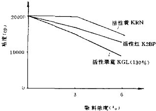 三、合成增稠劑ALCOPRINT RND在印花上的應用 1.活性染料 不同染料濃度對6%ALCOPRINT RND粘度的影響.見下圖: