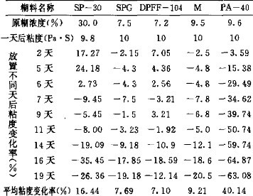 將含有防腐劑M 等五種糊料在5月下旬室溫20℃放置24h后,將糊料恒溫至25±l℃測定粘度,分別以第一天所測粘度值為基準(zhǔn)算出粘度變化率評定原糊穩(wěn)定性,列于表2