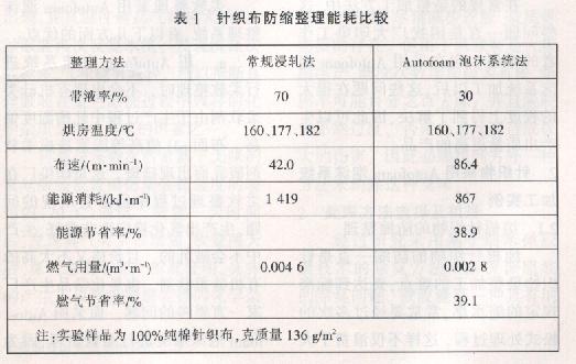 采用Autofoam泡沫系統(tǒng)加工紡織品的時(shí)候,帶液率只有10%~35%,但實(shí)際上帶液率的高低是根據(jù)加工內(nèi)容的需要而選擇的。如進(jìn)行單面防水整理時(shí).帶液率通常選擇為15%~20%;而進(jìn)行全滲透時(shí),如一些柔軟整理.防皺、防縮整理,阻燃整理等,帶液率一般要控制在35%左右,即使這樣也比常規(guī)方法的帶液率減少一半左右。因此,ALttofoam泡沫系統(tǒng)能夠有效地節(jié)約能源,具體如表1所示。