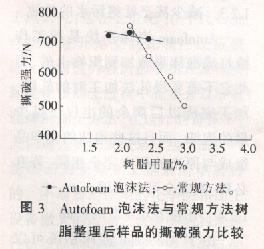 Autofoam泡沫系統(tǒng)可大大減少強(qiáng)力的下降。在實(shí)驗(yàn)中發(fā)現(xiàn):纖維素纖維的防皺、防縮整理.純棉織物的耐久阻燃整理,這些伴隨著樹脂在催化劑的作用下發(fā)生交聯(lián)的產(chǎn)品,采用Autofoam泡沫系統(tǒng)加工后,強(qiáng)力的下降雖然也是不可避免的,但是比常規(guī)的方法要低很多,見圖3所示。
