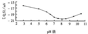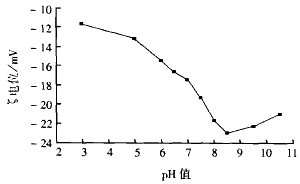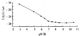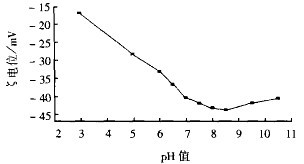 在0.2g/L顏料黃14懸浮液中加入一定濃度的高分子分散劑,經(jīng)超聲波振蕩后等分為10份,分別用NaOH和HCl調(diào)節(jié)pH后,放入恒溫振蕩器中在30℃下振蕩20min,靜置取樣放入JS94F型微電泳儀中測試ξ電位.使用0.001mol/L的NaCl調(diào)節(jié)懸浮液的離子強度.