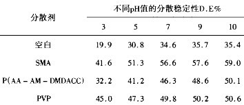 表1 不同類型高分子分散劑對顏料黃14的分散穩(wěn)定性D.E 由表1可以看出:D.E值越大表明懸浮液光密度越大,顏料粒子自由沉降越少,顏料黃14分散體系越穩(wěn)定.陰離子型高分子分散劑SMA對顏料黃14的分散穩(wěn)定性最好,非離子型高分子分散劑PVP次之,兩性型高分子分散劑最差.各種高分子分散劑在堿性條件下都具有良好的分散穩(wěn)定性,在酸性條件下分散穩(wěn)定性差,顏料黃14的懸浮液隨著pH值上升而趨于穩(wěn)定.此外,對非離子型高分子分散劑PVP來說,分散穩(wěn)定性數(shù)據(jù)也說明了PVP在顏料表面的吸附不是靠靜電引力,而是由范德華力起主導(dǎo)作用,顏料粒子的穩(wěn)定主要是空間位阻起作用.因此,對于非離子型高分子分散劑來說,ξ電位并不能說明其分散能力,需要其它的測試方法加以驗證;對于陰離子和兩性型高分子分散劑來說,可以用ξ電位來表征其分散能力。 3 結(jié)論