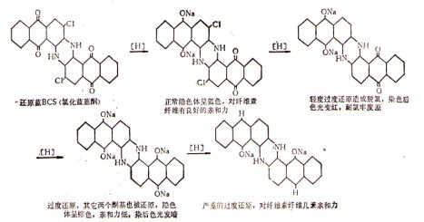 【集萃網(wǎng)觀察】各個(gè)染料對(duì)各種還原條件(燒堿、保險(xiǎn)粉濃度、溫度、時(shí)間)的反應(yīng)是不同的,有時(shí)除了正常的還原外,還會(huì)發(fā)生不同的旁支反應(yīng),主要的有: (一)過(guò)度還原作用 有些含有氮苯結(jié)構(gòu)的染料——黃蒽酮和藍(lán)蒽酮染料,其分子結(jié)構(gòu)中的酮基,在正常情況下,并不是全部都被還原的,如果還原浴的溫度過(guò)高,時(shí)間稍久,就會(huì)引起過(guò)度還原。例如還原藍(lán)RSN(藍(lán)蒽酮染料)的一般還原浴溫度為60℃,如超過(guò)70℃,時(shí)間較長(zhǎng)便會(huì)發(fā)生過(guò)度還原,補(bǔ)救方法可在染浴中加1-1.5克/升的亞硝酸鈉,或用2克/升的葡萄糖代替;又如還原藍(lán)BCS(氯化藍(lán)蒽酮)在過(guò)度還原的同時(shí),還會(huì)脫氯(統(tǒng)稱脫鹵),反應(yīng)式如下: