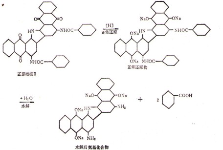 (二)水解作用 在較高的溫度和濃堿的作用下,具有酰胺基(—CONH—)結(jié)構(gòu)的染料,會(huì)發(fā)生不同程度的水解,生成色澤較深的氮基化合物,影響成品的色澤及牢充。例如,還原橄欖R,會(huì)產(chǎn)生如下反應(yīng):