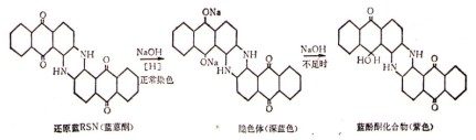 (三)染料分子重排 染料經(jīng)還原后,在強(qiáng)堿介質(zhì)中成隱色酸鈉鹽,如堿的用量不足,可引起某些染料的分子重排,生成難溶于水的蒽酚酮化合物,即使再加燒堿,也難以重復(fù)使其成為隱色體,反應(yīng)式如下: