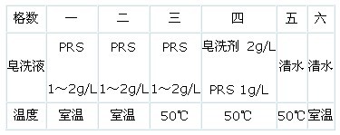 活性染料在棉織物上印花使用上海防沾污皂洗劑PRS較好,皂洗工藝如下表。