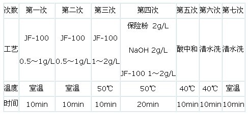 分散染料在滌/棉織物上印花用的白地防沾污皂洗劑浙江JF-100,皂洗工藝如下: